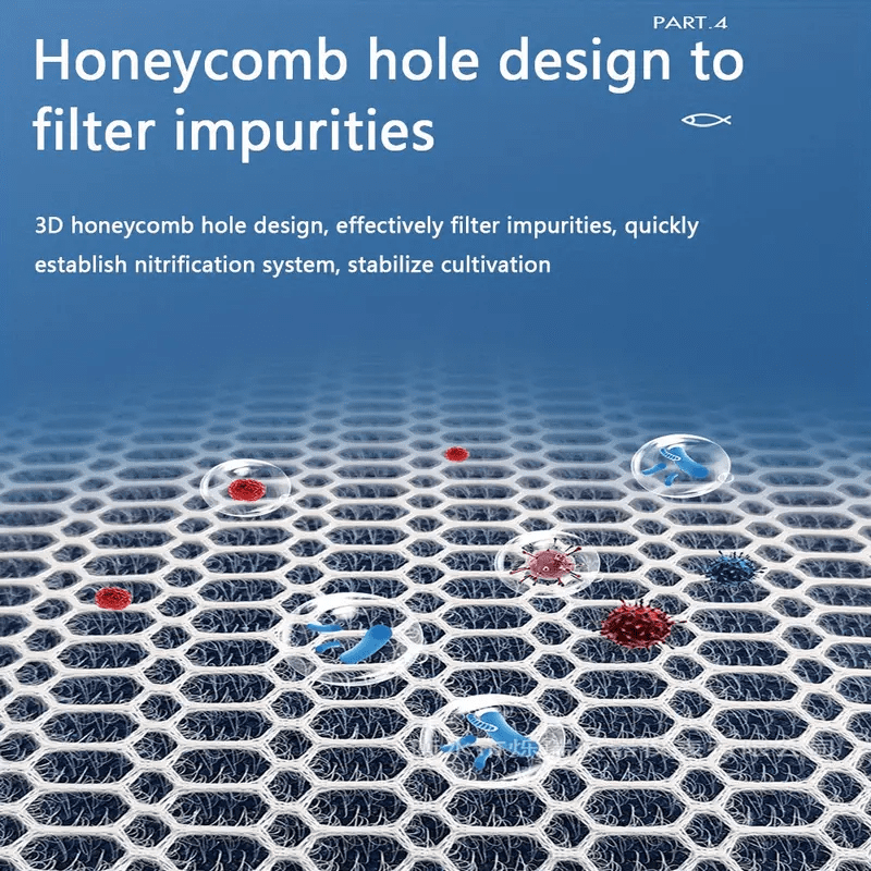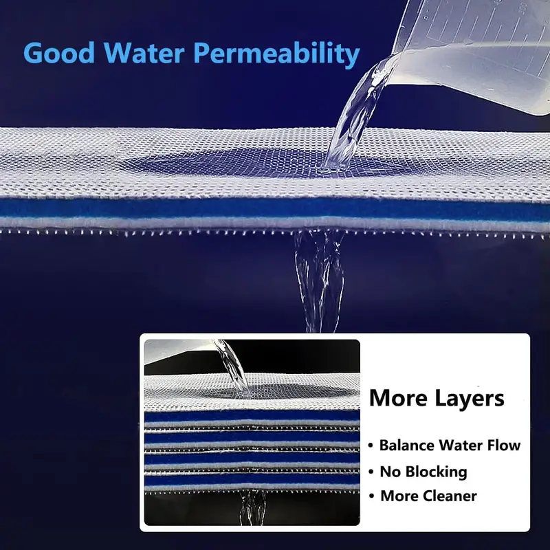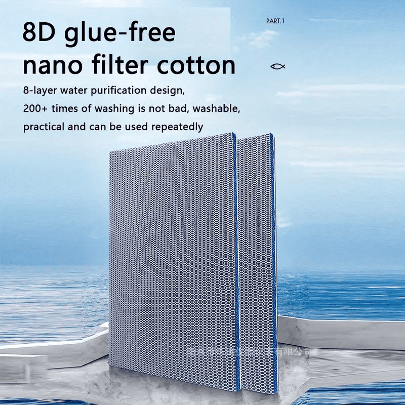 Using bio materials, no glue, adhesive, no peculiar smell, no harm to fish. Good water permeability, no clogging, and anti-overflow. 8-layer Water Purification Design 3D Honeycomb Mesh Cloth Stereo Hydrophobic Fiber Layer Precision Carbon Fiber Cotton Glue-free Nano Biochemical Cotton Fiber Biochemical Cotton Precision Carbon Fiber Cotton Stereo Hydrophobic Fiber Layer 3D Honeycomb Mesh Cloth