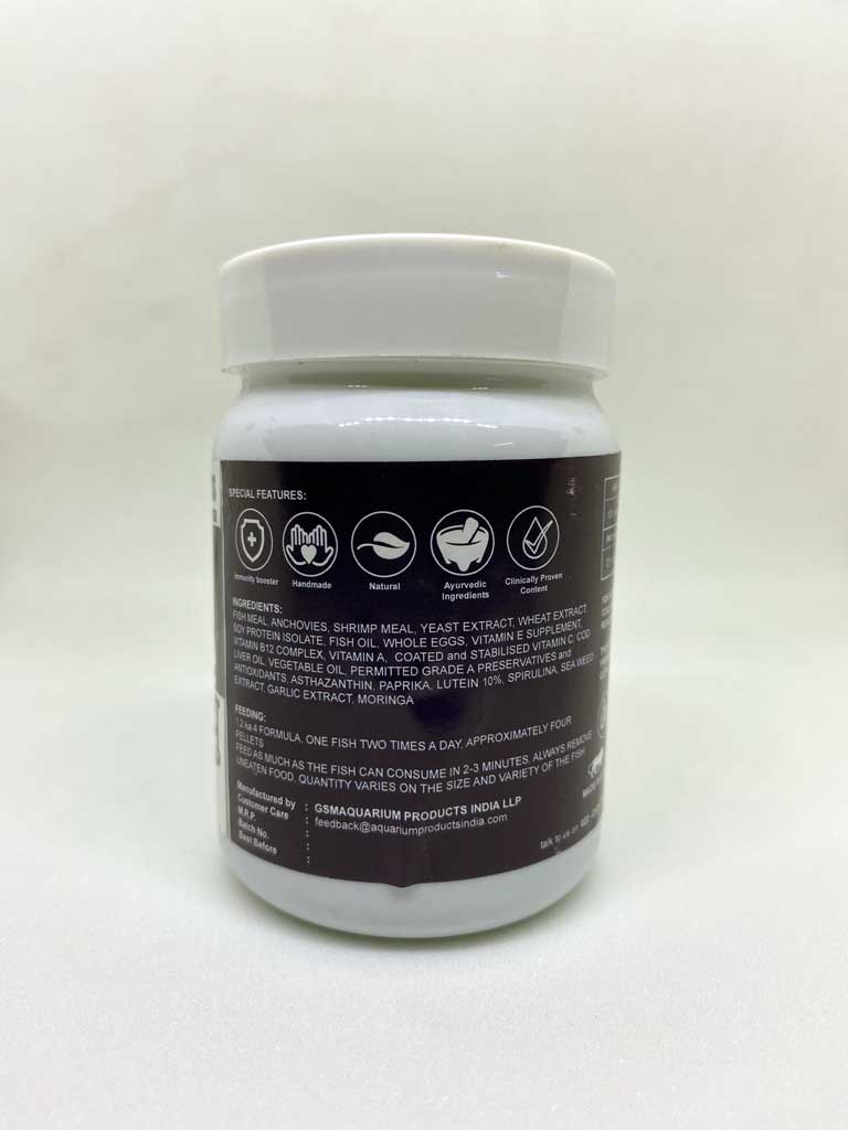 Fish Meal, Anchovies, Shrimp Meal, Yeast Extract, Wheat Extract, Soy Protein Isolate, Fish Oil, Whole Eggs, Vitamin E Supplement, Vitamin B12 Complex, Vitamin a, Coated and Stabilised Vitamin C, Cod Liver Oil, Vegetable Oil, Permitted Grade a Preservatives and Antioxidants, Asthaxanthin, Paprika, Lutein 10%, Spirulina, Sea Weed Extract, Garlic Extract, Moringa