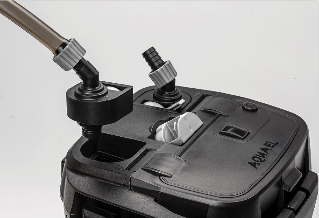 For example, with AQUAEL Ultramax you can clean the pre-filter without removing the pump head of the filter. To access the prefilter, simply open a flap on the pump head. This can be done quickly with a few handles. Neither the pump head itself nor the tubes need to be removed. There are also other useful details, such as rotatable hose adapters and an efficient self-priming mechanism. The three filter baskets can be filled individually with any filter material. Of course, the external filter comes already filled with filter material and ready for connection to you.