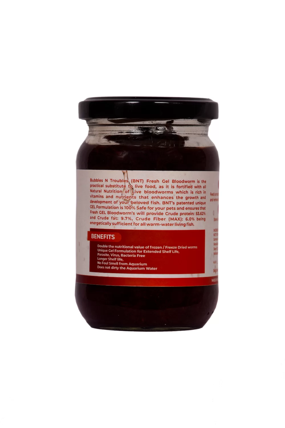 Bubbles N Troubles (BNT) Fresh Gel Bloodworm is the practical substitute to live food, as it is fortified with all Natural Nutrition of Live blood worms which is rich in vitamins and nutrients that enhances the growth and development of your beloved fish. BNT’s patented unique GEL Formulation is 100% Safe for your pets and ensures that Fresh GEL Bloodworm’s will provide: