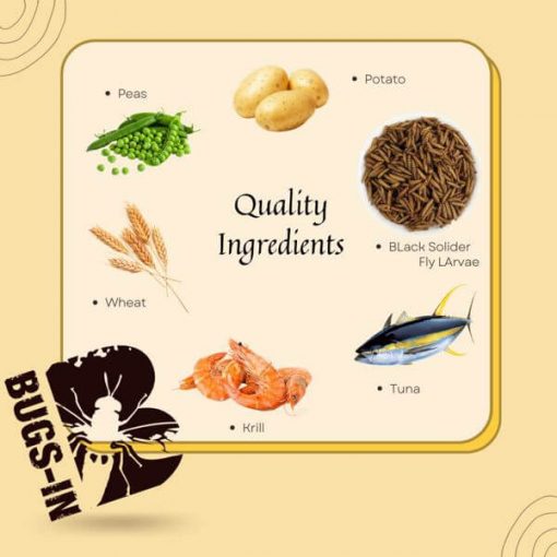 Black Soldier Fly Larvae (BSFL), Tuna & Krill Meal, fish Protein concentrate, Green Peas, Potato, Wheat, dicalcium phosphate, calcium carbonate, DL-Methionine, Lecithin, Choline Chloride, L-Lysine, vitamin E supplement, Biotin, Niacin, Calcium L-Ascorbyl-2-Monophosphate, marigold extract, Zinc Oxide, Manganous Oxide, D-Calcium Pantothenate, Vitamin B12 supplement, Beta-Carotene, Rosemary extract, riboflavin, Copper Sulfate, Pyridoxine hydrochloride, Thiamine Mononitrate, Inositol, Folic Acid, Vitamin A supplement, Calcium Iodate, Sodium Selenite, Vitamin D3 supplement.