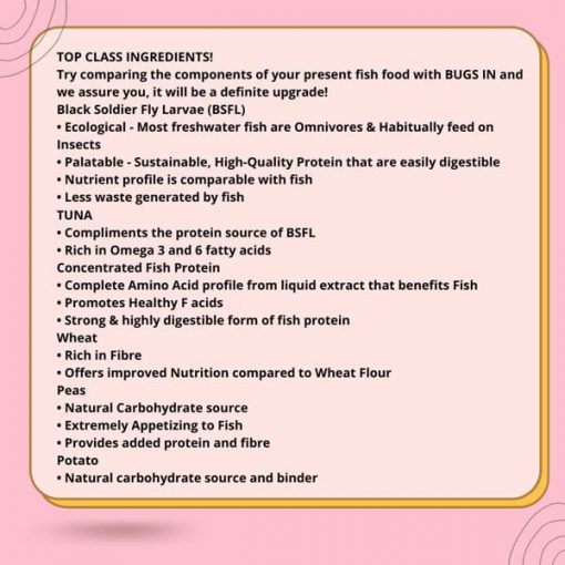 BUGS-IN Fish Food is based on the concept of sustainable and wholesome Pet diet for Fishes with high quality ingredients derived from Black Soldier Fly Larvae.