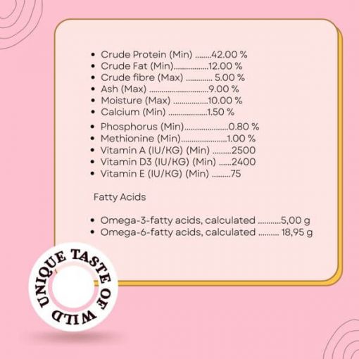 Black Soldier Fly Larvae (BSFL), Tuna & Krill Meal, fish Protein concentrate, Green Peas, Potato, Wheat, dicalcium phosphate, calcium carbonate, DL-Methionine, Lecithin, Choline Chloride, L-Lysine, vitamin E supplement, Biotin, Niacin, Calcium L-Ascorbyl-2-Monophosphate, marigold extract, Zinc Oxide, Manganous Oxide, D-Calcium Pantothenate, Vitamin B12 supplement, Beta-Carotene, Rosemary extract, riboflavin, Copper Sulfate, Pyridoxine hydrochloride, Thiamine Mononitrate, Inositol, Folic Acid, Vitamin A supplement, Calcium Iodate, Sodium Selenite, Vitamin D3 supplement.