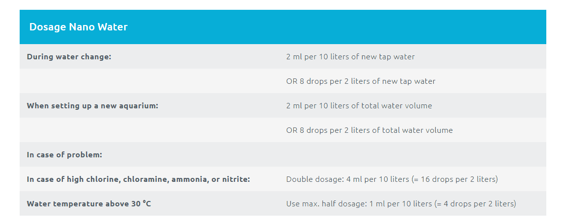 Nano Water is best added to the tap water used for water changes. In this case, only use the dosage for the volume of new tap water. This way, harmful substances are neutralized immediately. Nano Water can of course also be added directly to the aquarium. In that case, base the dosage on the total volume of aquarium water.