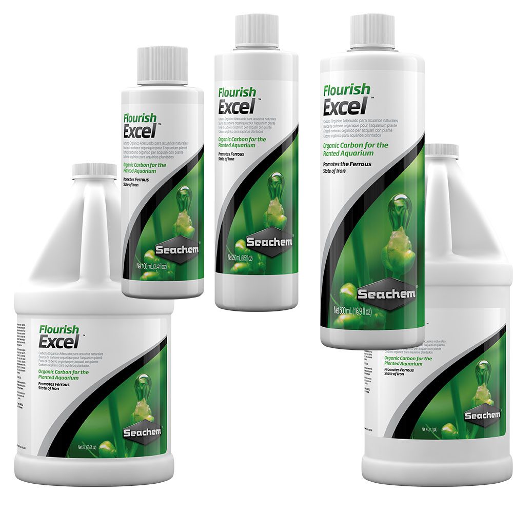 SeaChem Flourish Excel™ is a source of bioavailable organic carbon. All plants require a source of carbon. This is typically obtained from CO2, but, may also be derived from simple organic compounds (such as photosynthetic intermediates). The use of either CO2 injection or Flourish Excel™ does not necessarily negate the use of the other. Because the processes of producing photosynthetic intermediates and building onto them occur simultaneously, one can derive a substantial benefit with the use of Flourish Excel™ either alone or in conjunction with CO2 . The combination is particularly ideal for situations when continuing to add CO2 could result in dangerously low pH levels. Flourish Excel™ also has iron reducing properties which promote the ferrous state of iron (Fe+2), which is more easily utilized by plants than ferric iron (Fe+3).