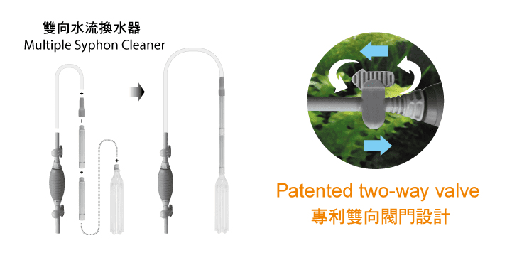 ●Patented two-way valve, following the narrow of the valve to draw out of the water and fill up your aquarium in ease with one tube.