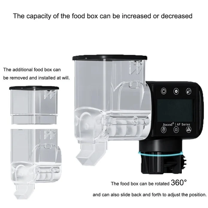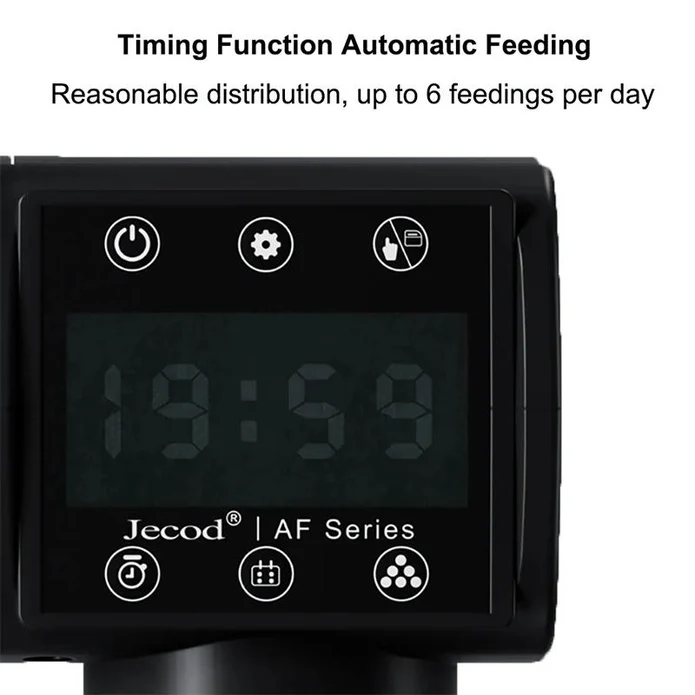 Available set daily feeding time Available set the clock by synchronize with local time Auto feeding maximum 6 times per day, set the feeding time on time Freely set the volume of each feeding, up to 9 servings per feeding Compact size and multifunction LCD Display, visible the clock, feeding parameters and the battery level display The food hopper turns around by 360 rotation.