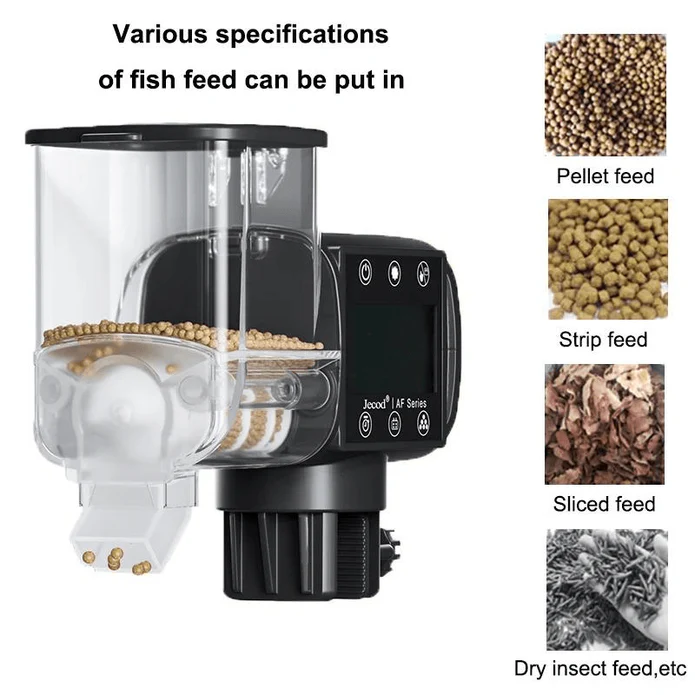 Feeds all kinds of fish foods, including flakes, pellets, powders and strips. Ideal for home fish tanks and aquariums.