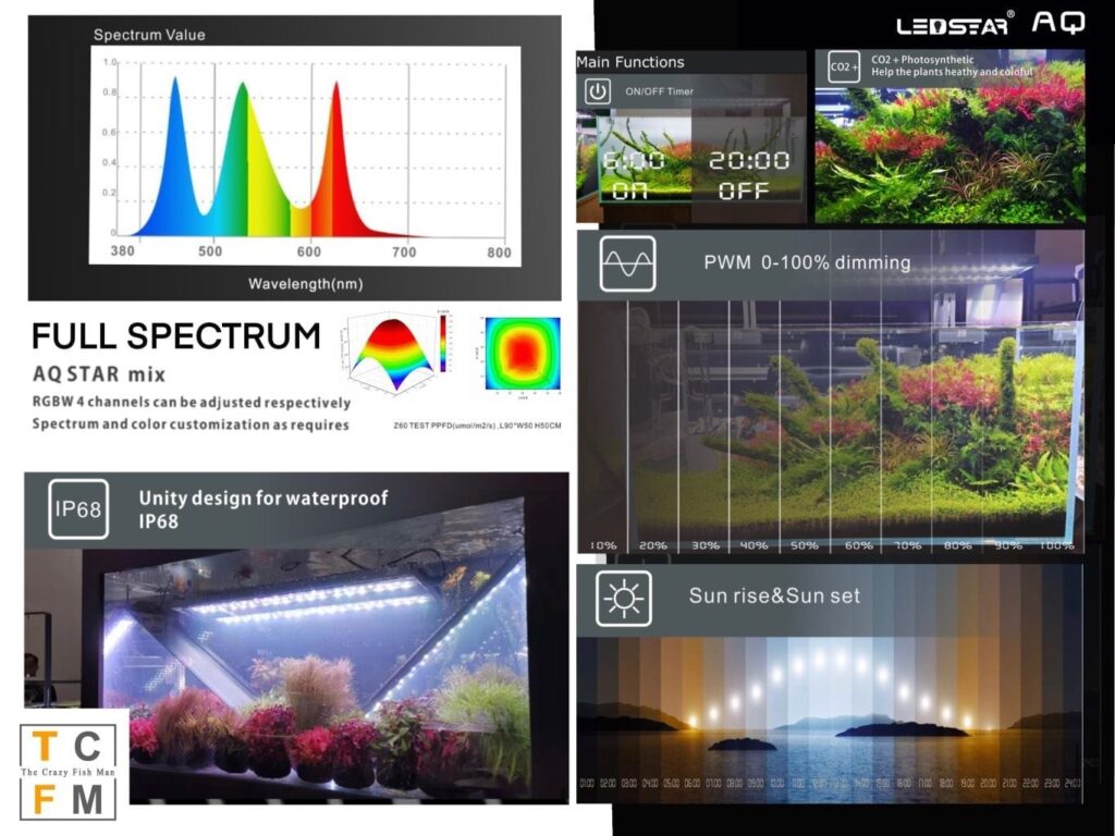 - “AQ STAR” App offers timer control and individual color management. Sunrise and sunset can be ramped up or down to imitate natural sunrise and sunset