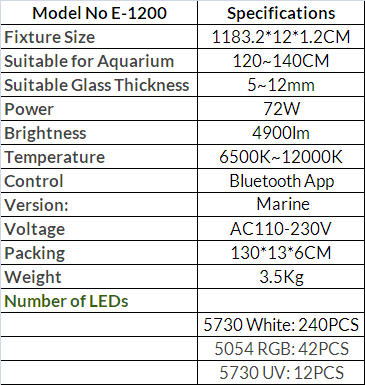 Number of Marine LEDs: 5730 Blue: 240PCS, 5054 RGB: 42PCS, 5730 UV: 12PCS