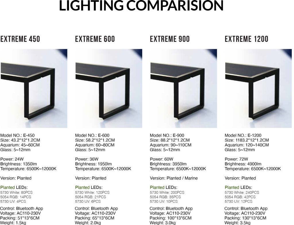 The extreme series II adopts an all-aluminum body, use the diffuser panel, with full-spectrum and soft light energy, making aquatic plants lifelike. The addition of UV light makes the entire spectrum more unique and efficient. The configuration of the retractable stand can be adapted to more aquariums of different sizes. Built-in Bluetooth App control module, fast connection, rich control settings, allowing you to easily control your light energy ratio.