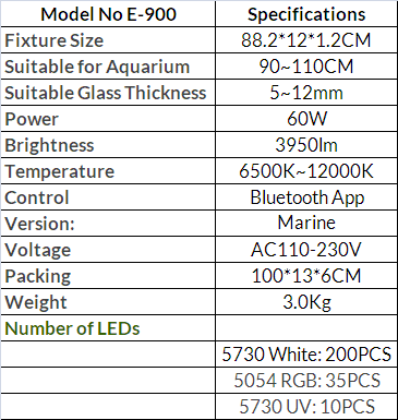 The extreme series II adopts an all-aluminum body, use the diffuser panel, with full-spectrum and soft light energy, making aquatic plants lifelike. Size: 88.2*12*1.2CM / Suitable for Aquarium: 90~110CM / Glass Thickness: 5~12mm