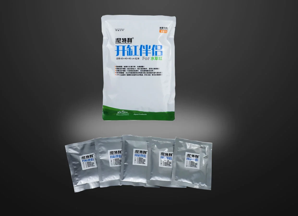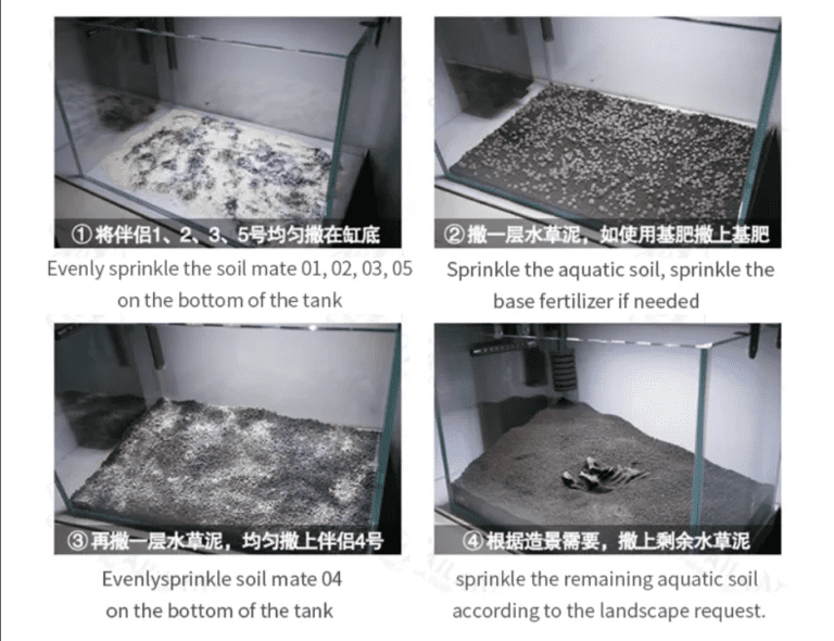 First of all, sprinkle the soil mate 01, 02, 03, 05 evenly on the bottom of the tank (leave a distance of about 1 cm between the powder and the tank wall), and then spread 1 cm thick aquatic soil. Sprinkle soil mate No. 4, and finally sprinkle the remaining aquatic soil according to the landscape request.