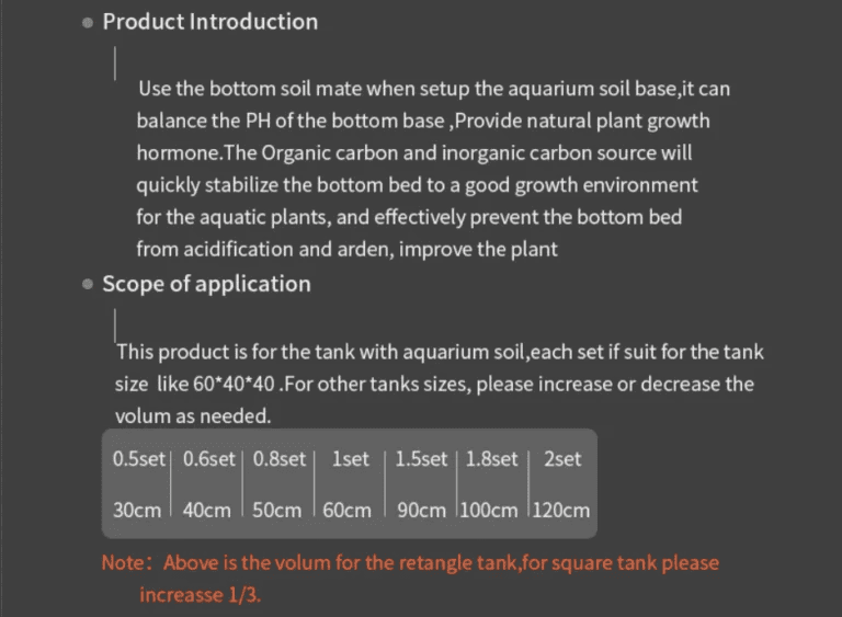 Use the bottom soil mate when setup the aquarium soil base, it can balance the PH of the bottom base, Provide natural plant growth hormone. The Organic carbon and inorganic carbon the source will quickly stabilize the bottom bed to a good growth environment for the aquatic plants, and effectively prevent the bottom bed from acidification and Arden, improve the plant root activity, prevent breeding the blue-green algae, and maintain a long term good breeding environment for the aquatic plants.