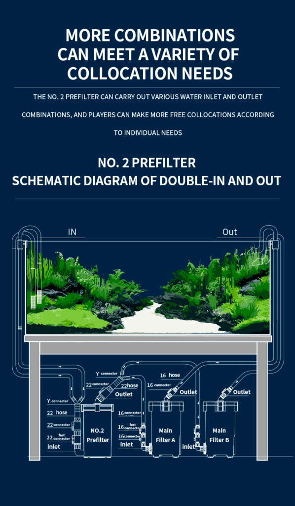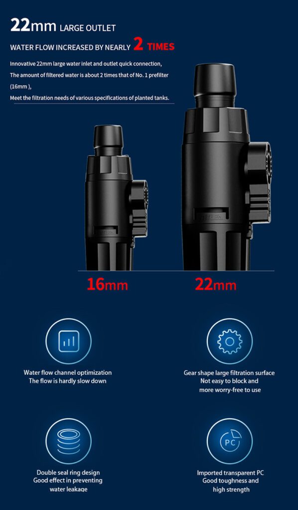 Innovative gear shaped 80 mesh high density filter cotton greatly increases the filter surface area, which is about 2 times that of previous model and about 10 times of the large-size pre-filter on the market