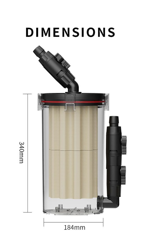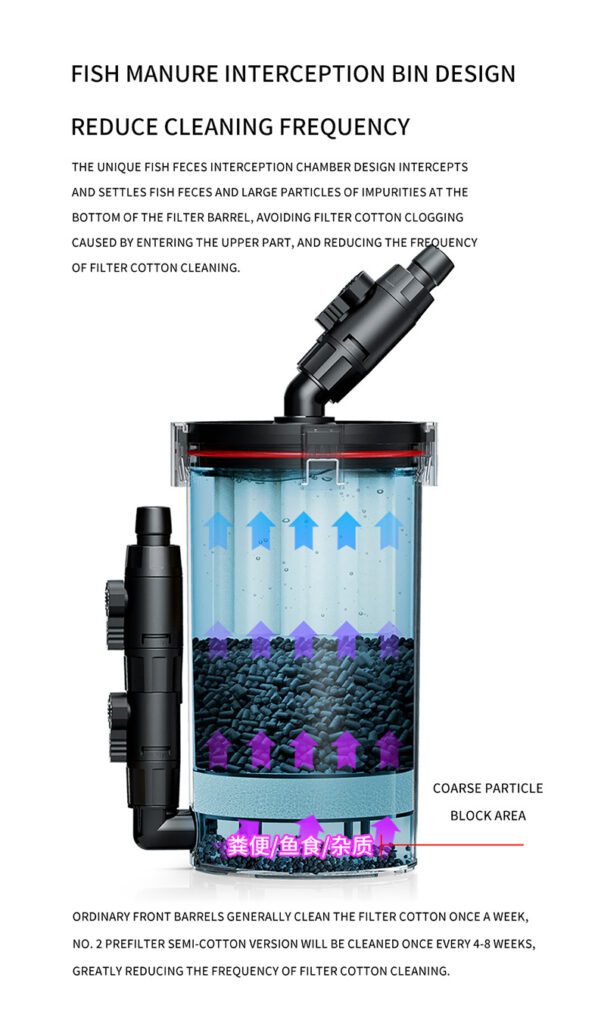 The unique fish feces interception chamber design intercepts and settles fish feces and large particles of impurities at the bottom of the filter barrel, avoiding filter cotton clogging caused by entering the upper part and reducing the frequency of filter cotton cleaning