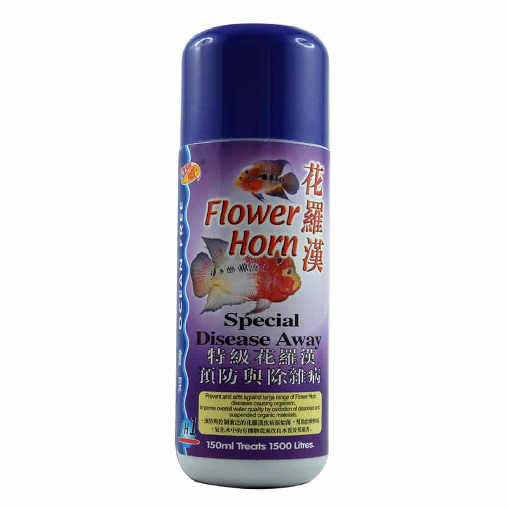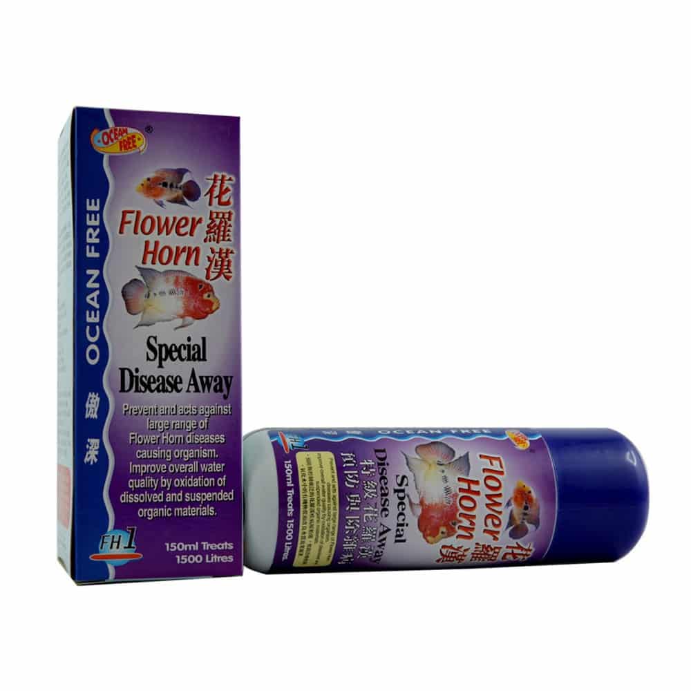 Special Flower Horn Disease Away” is the latest breakthrough in the Ocean Free medication series to prevent and act against a large range of Flower Horn diseases causing organism Dieseases include hexamita, gill diseases, bacteria infestation, fungus attack, sparazon, external parasites, external lesions, prorozoa(costia, chilodonella, trichoding etc), crustacea (argulus, lernaea) This medication is safe and easy to use and recommended to use as preventive measure for your fish It is a disinfectant as well to improve water quality Excellent medication to be used for dip treatment of fishes and aquatic plants Special formulated for the Flower Horn(Raj Cichild) family