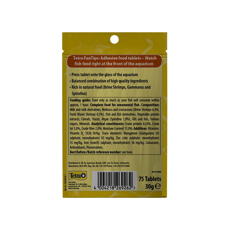 The FunTips Tablets include animal constituents such as daphnia, krill and shrimps, which make up over 20 percent of the overall ingredients. However, the adhesive tablets are also made from plant ingredients, including several types of algae. Therefore Tetra FunTips Tablets are made up of 42 percent protein and five percent fat. The adhesive food tablets are more than just a healthy treat for your fish to snack on.
