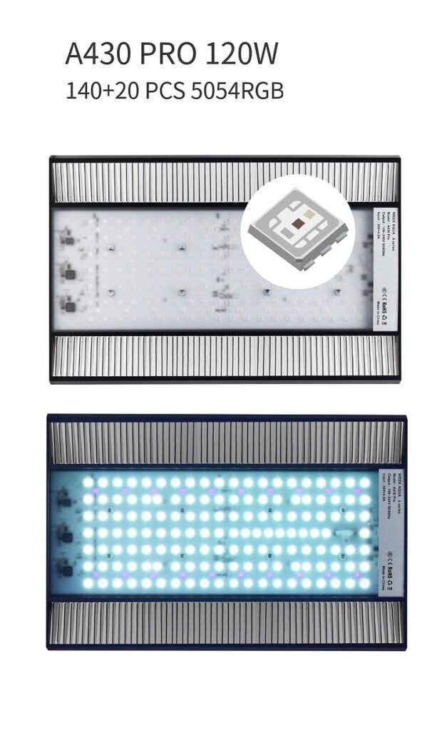 | A430 Pro | 120W | RGB-UV | AC100-240V | 7200lm | 140+10 | 60cm onwards |