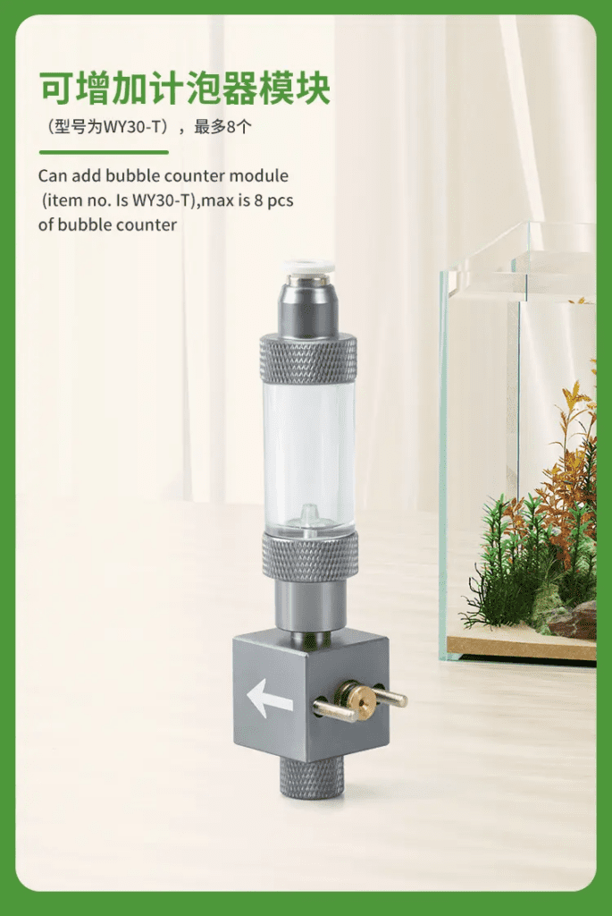 A quick-plug bubble counter makes connecting 4/6mm CO₂ tubing easy, and a precision needle valve allows for fine control of CO₂ flow.