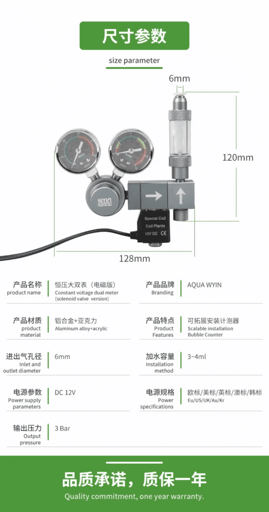 This is a single-stage regulator featuring two clear pressure gauges for monitoring both cylinder and working pressure. It comes with one output manifold equipped with a precision needle valve and a quick-plug bubble counter for easy tubing connection and flow control. The integrated 12V DC solenoid valve allowing you to automate CO₂ injection to suit your lighting cycle.